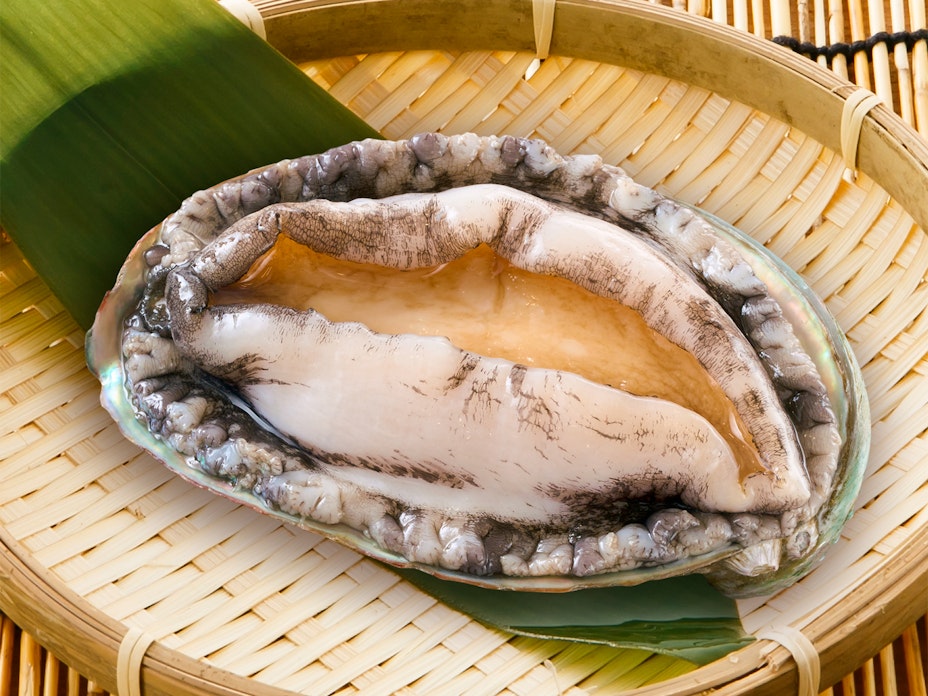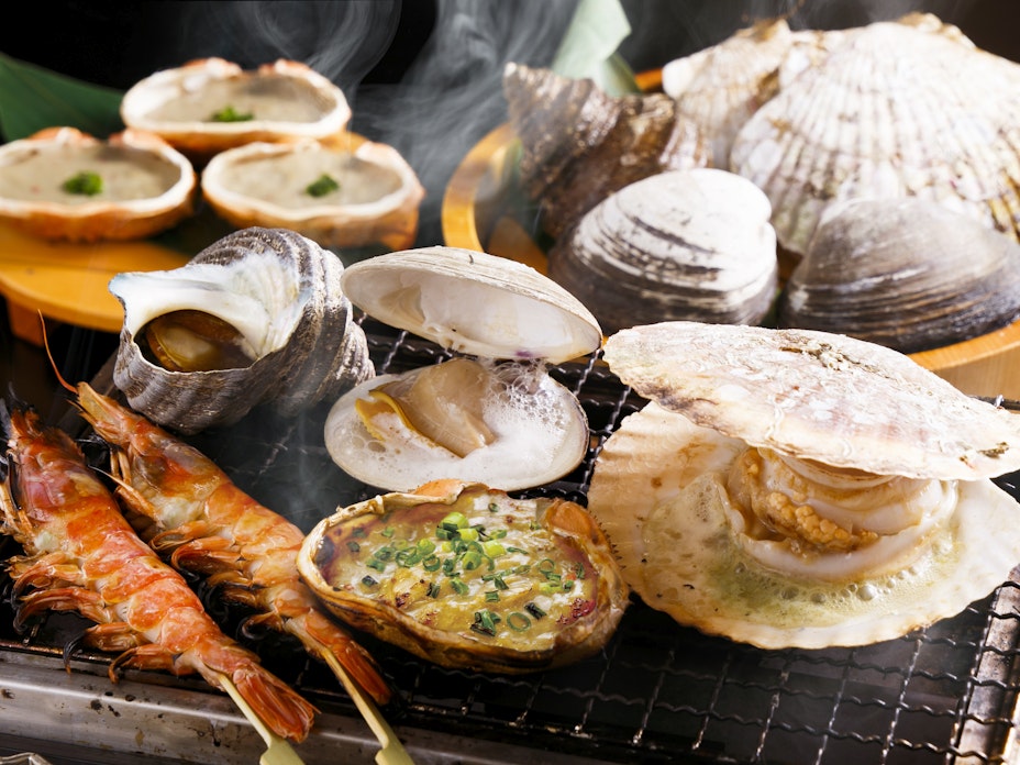 活貝を卓上で焼く磯丸焼き。蟹味噌が名物。 -